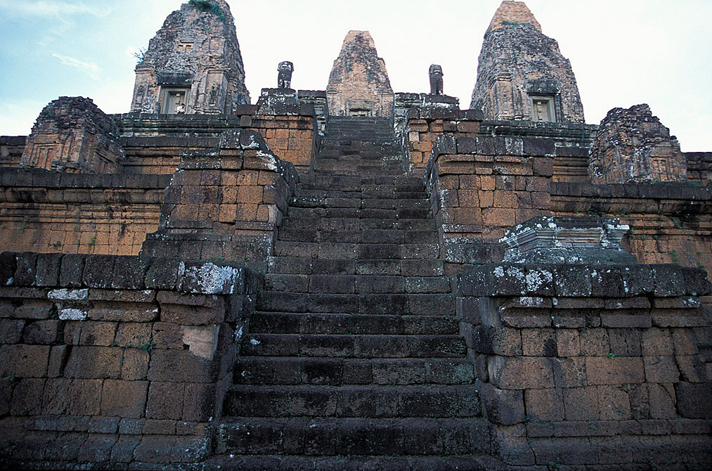 Pre rup was constructed using laterite and brick, which give a pleasant reddish appearance to it. It looks awesome in early morning and late afternoon sunlight. It has a square lay out and a laterite wall surrounds the temple on all four sides. It features a massive gopura that has three doorways. The main entrance is at the east gopura, where you can see a row of six towers. The first tier in the east gopura can be reached by a steep staircase. You can find libraries on either side of the walkway on the second platform. There is a stone reservoir, which must once have been a basement for a nandi statue. Nandi is the vehicle of Shiva and it is a common practice in Hindu temples to keep nandi statue in front of Shiva.
