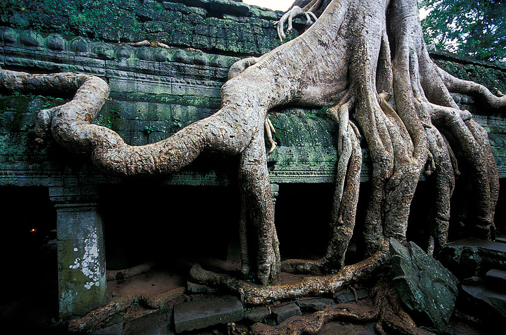 Ta Prohm is a fabulous site surrounded by great trees. The leaves of these trees filter the sunlight and give cool shade over this ethereal site. The sunrays passing through the leaves spread a fantastic greenish light. Exploring this monument can help us understand the power of Mother Nature. Some trees and vines hew the massive stones at Ta Prohm and fall over the top of the temple. We can enjoy the strangling root formation on the east Gopura, located near the entrance pavilion.